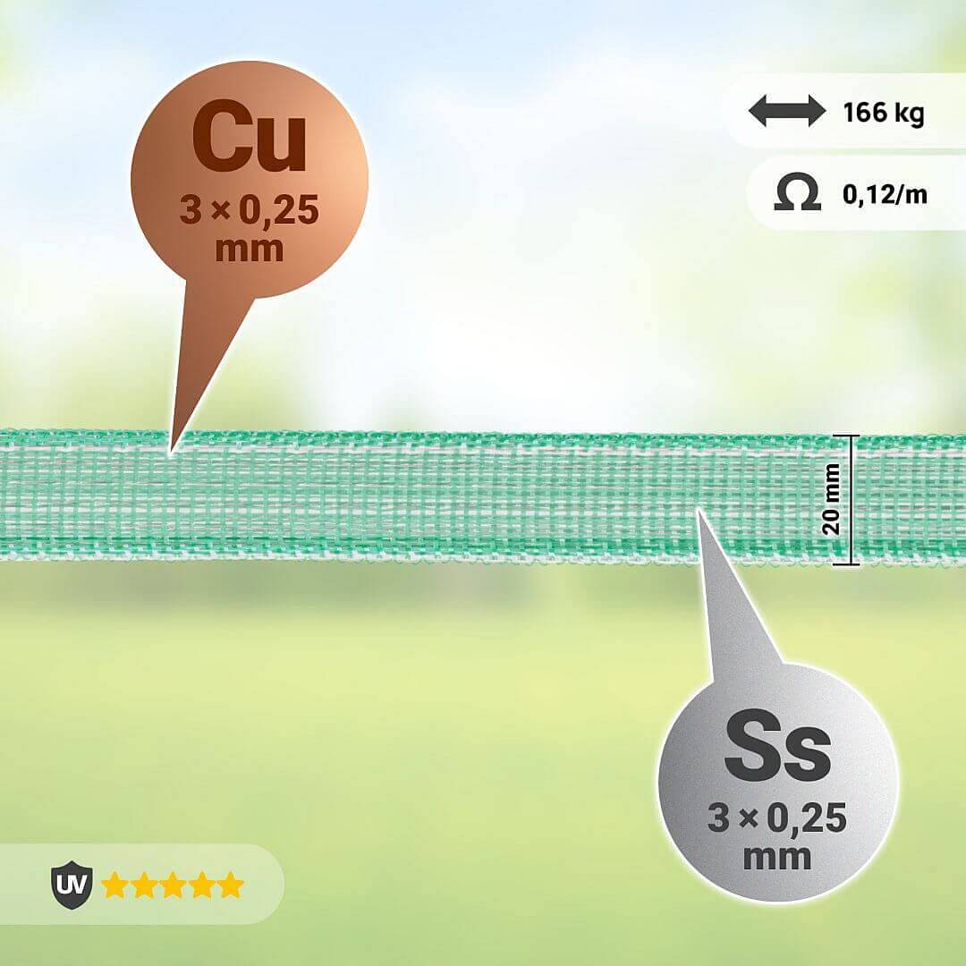 The complete electric fence kit includes 20 mm wide fence tape in a 200 m roll. The three copper conductors ensure maximum conductivity - a resistance of only 0,10 Ω/m. While the three stainless steel conductors take care of the strength of the wire. Fencing heights of up to 136 cm above the ground are created by mobile plastic posts with 11 eyelets for individual wire pulling. There is also a grounding rod. The complete electric fence kit is practical and easy to assemble.