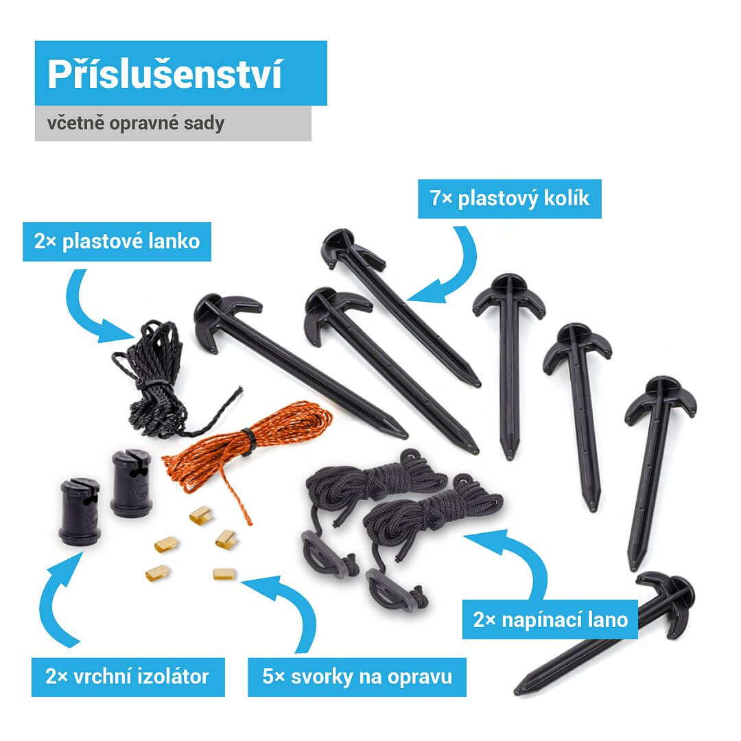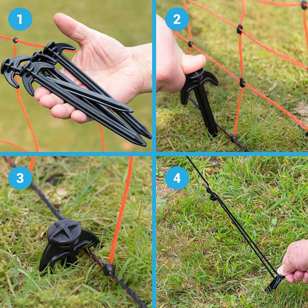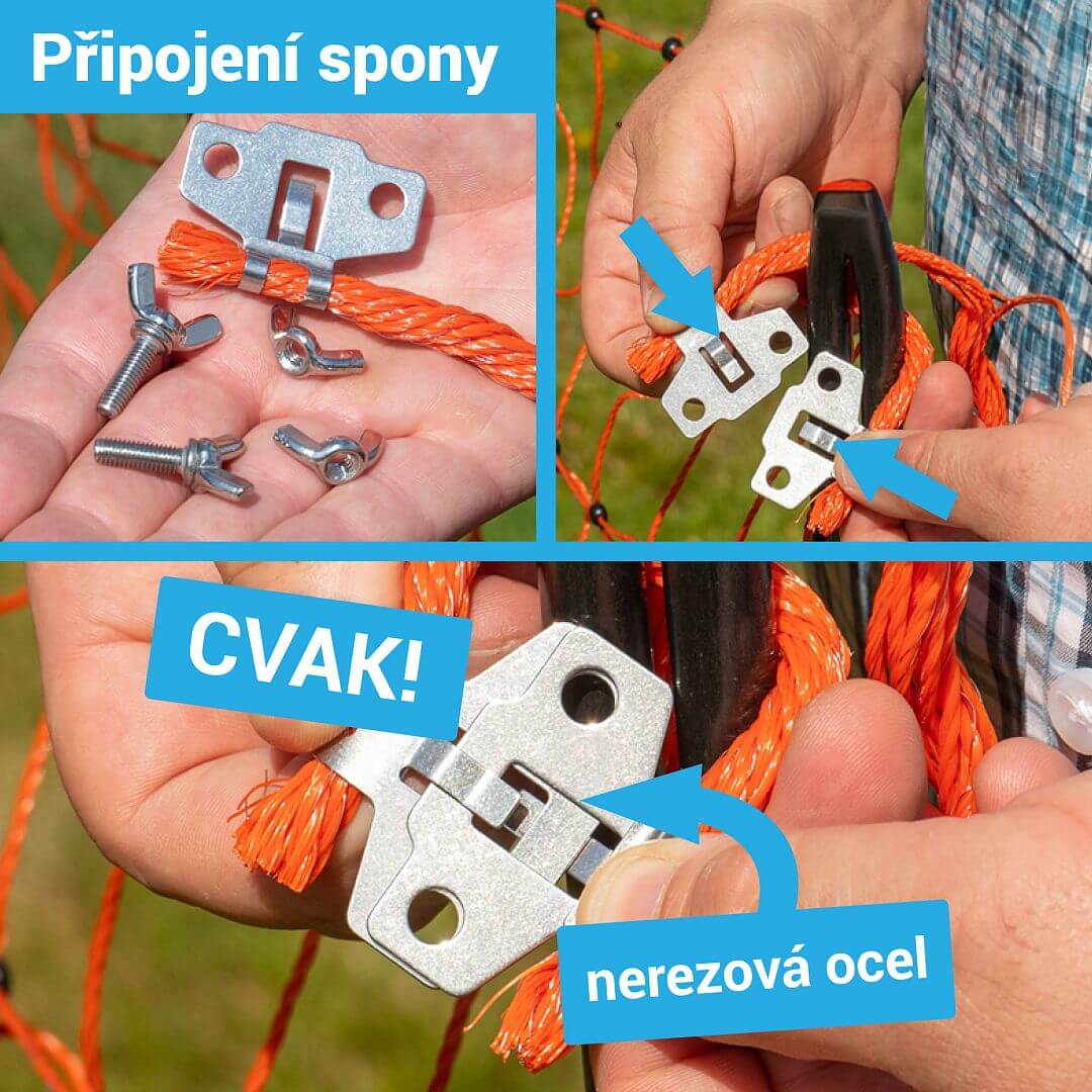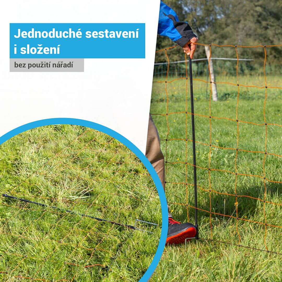 The kit includes an orange electric fence net with a height of 90 cm and a length of 50 m. Suitable for mobile enclosures with sheep or goats.