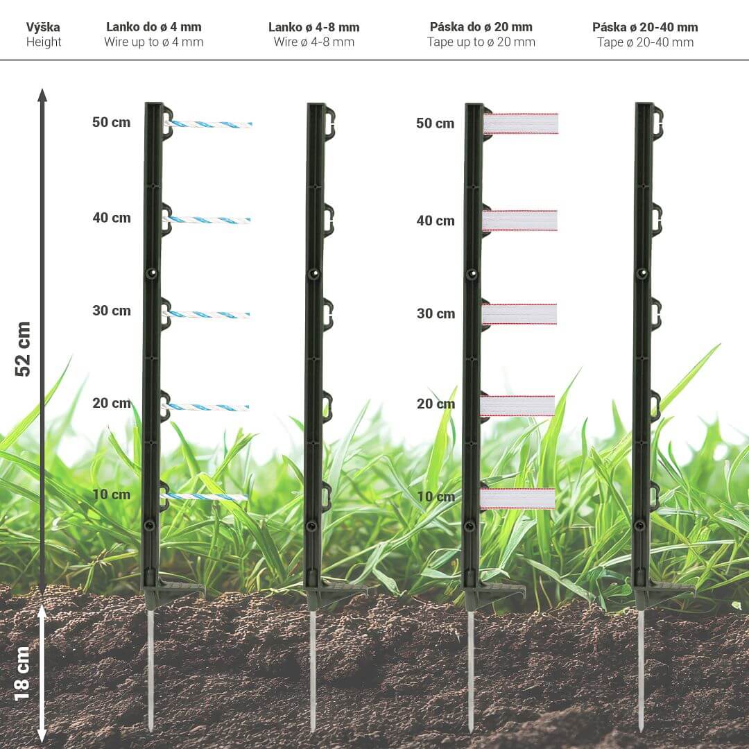 Green plastic posts 20 pcs with a total length of 70 cm, 52 cm above the ground. Green conductive wire with a diameter of 2,5 mm in a 100 m coil, 3 × 0,20 stainless steel wire. The set also includes a grounding rod.