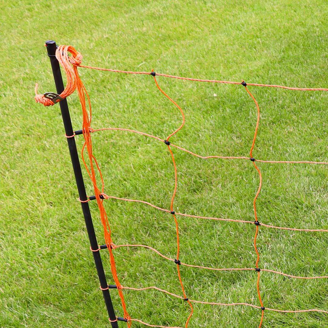 The electric sheep fencing net 90 cm with 13 bars and two spikes has 7 horizontal guide ropes with 3 x 0,20 mm thick stainless steel wire + 1 bottom row (black wire) is non-conductive, insulates. Net length 50 m. Net repair kit.