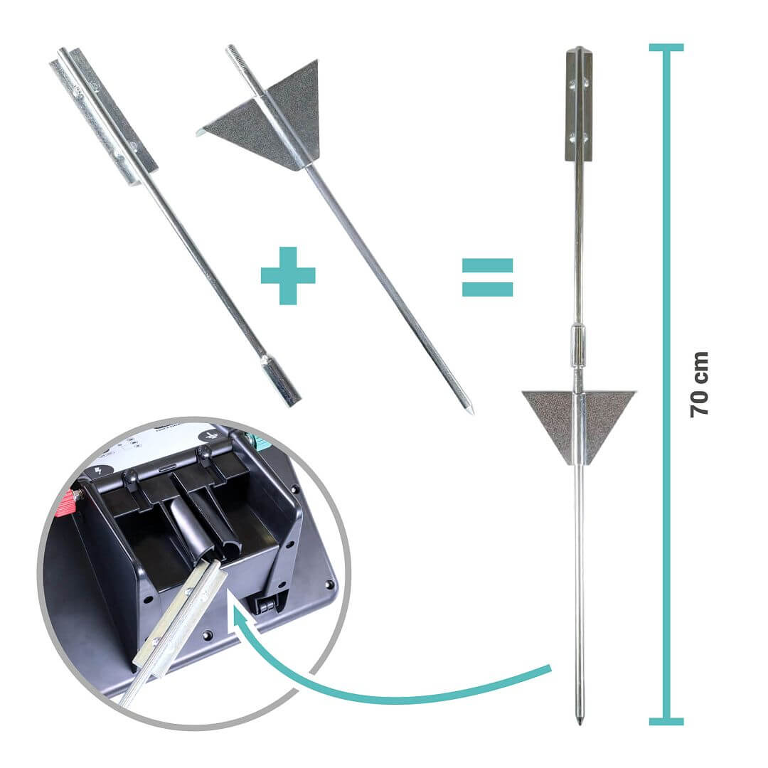 The mounting bracket on the rear of the device allows the fence to be attached to a special mounting and also earthing pole (included) at any location. For correct orientation of the solar panel to the sun, use the 360º rotation option. The device can also be mounted on a T-post or universal U-post.